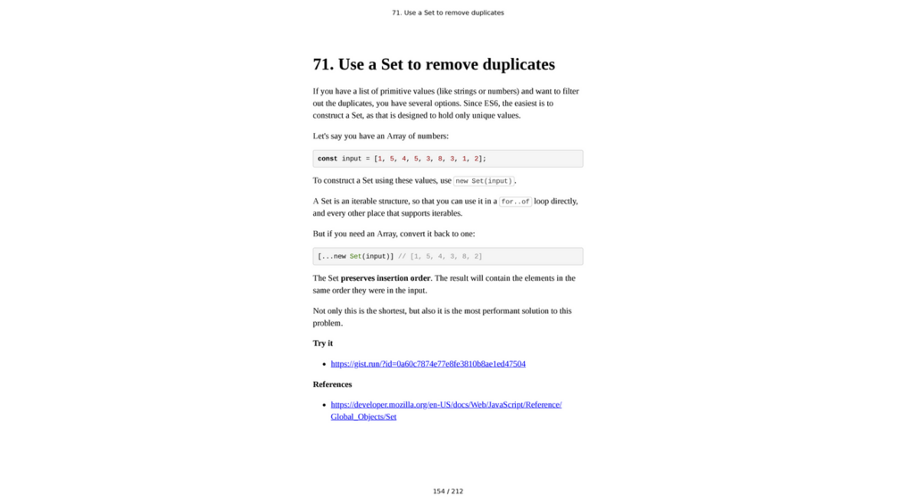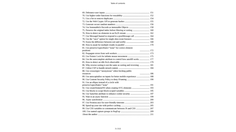 This book is the collection of all 100 tips I wrote and polished over the years. It spans a range of topics from elementary Javascript, such as the array destructuring operator and regular expressions, to some more targeted technologies such as RxJS streams and immutable collections. I'm sure you'll find at least some of them that you didn't know about.